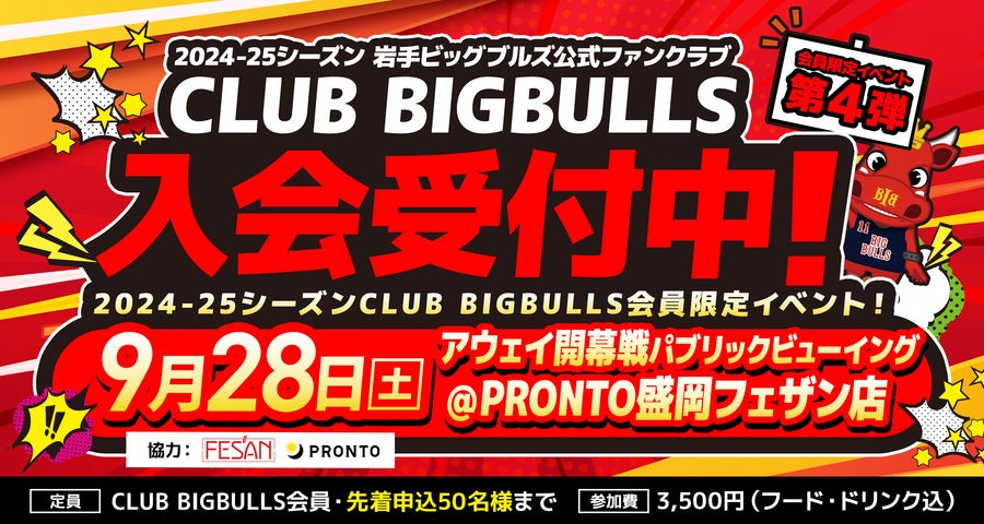 岩手ビッグブルズでは、2024年9月28日(土)にCLUB BIGBULLS会員様限定イベント第4弾として、金沢武士団とのアウェイ開幕戦パブリックビューイングを開催することが決まりましたのでお知らせいたします。