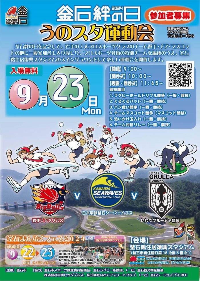 9/23(月・祝)に釜石鵜住居復興スタジアムで開催される「うのスタ運動会」に岩手ビッグブルズブースを出店します!また、10:00からRed Charmがオープニングパフォーマンスを行い、BULLZO&Red Charmも運動会に参加します!