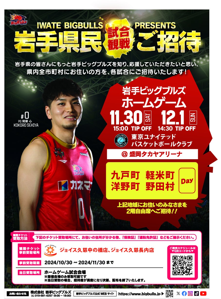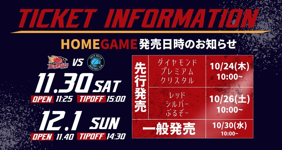 2024年11月30日(土),12月1日(日) 盛岡タカヤアリーナで開催する東京ユナイテッドバスケットボールクラブとのホームゲームのチケット販売スケジュールをお知らせいたします。