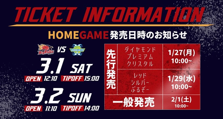 2025年3月1日(土),2日(日) 盛岡タカヤアリーナで開催する湘南ユナイテッドBCとのホームゲームのチケット販売スケジュールをお知らせいたします。