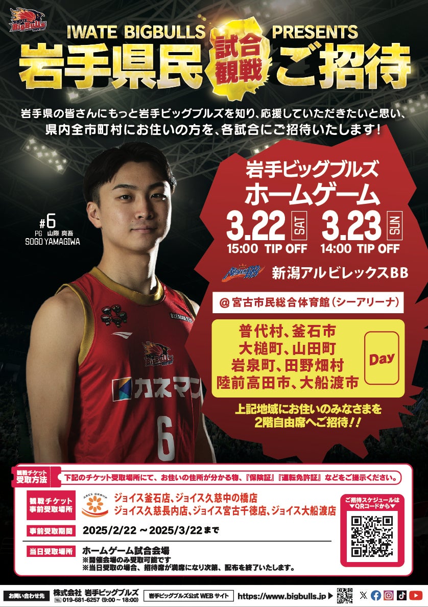 より多くの岩手県民の皆様にチームの魅力を知っていただくため3シーズン前からスタートした「33市町村招待プロジェクト」。新潟戦は、普代村 釜石市 大槌町 山田町 岩泉町 田野畑村 陸前高田市 大船渡市にお住まいの方をご招待いたします!
