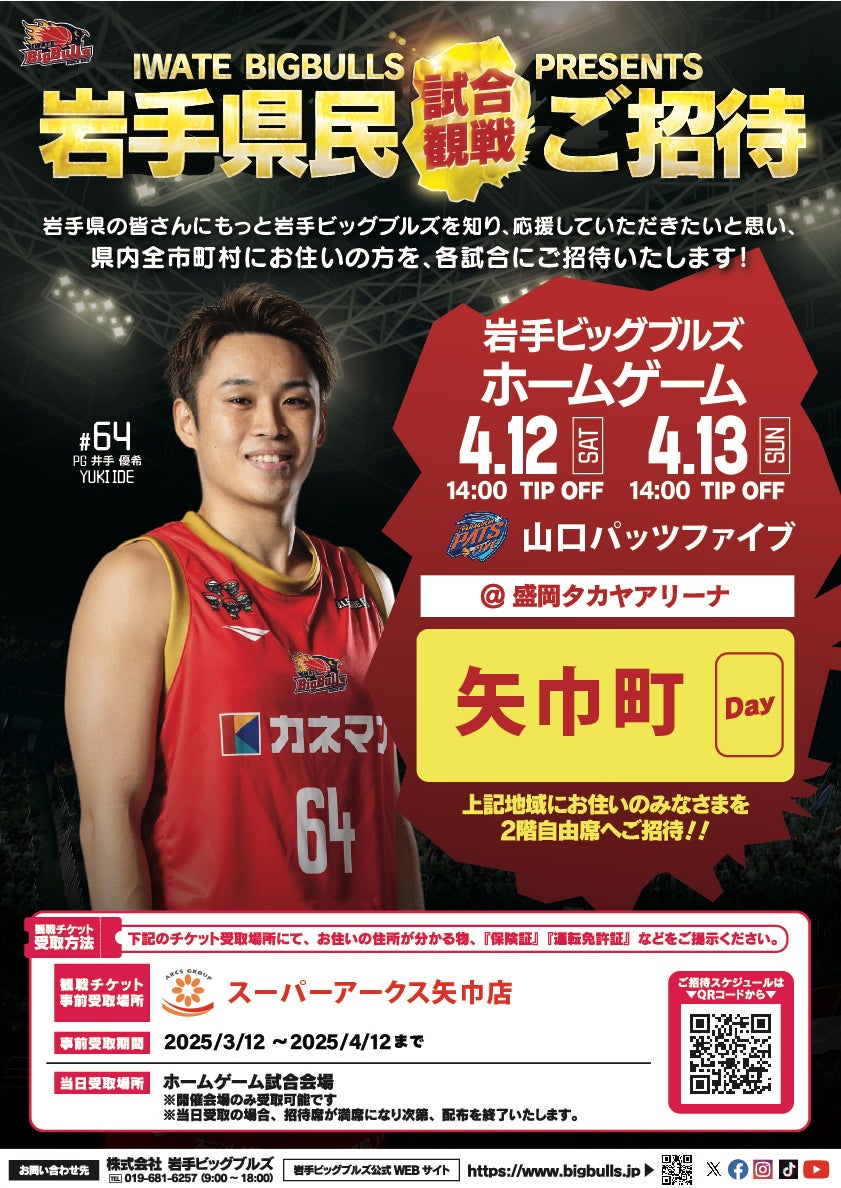 より多くの岩手県民の皆様にチームの魅力を知っていただくため3シーズン前からスタートした「33市町村招待プロジェクト」。山口戦は、矢巾町にお住まいの方をご招待いたします!