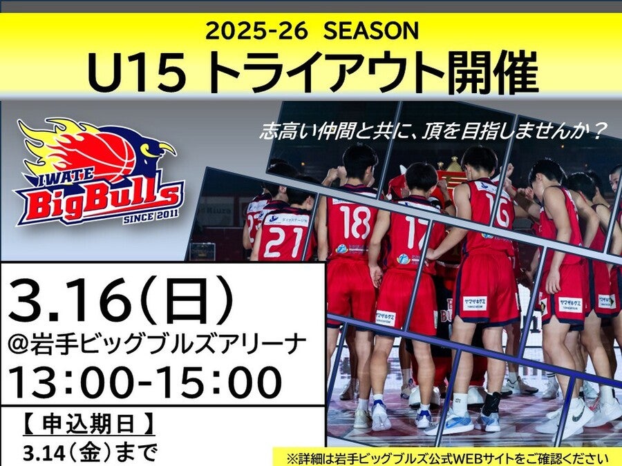 岩手ビッグブルズは、2025年3月16日(日)に矢巾町岩手ビッグブルズアリーナにて『第9期 岩手ビッグブルズ ユーストライアウト』を開催致しますのでお知らせ致します。