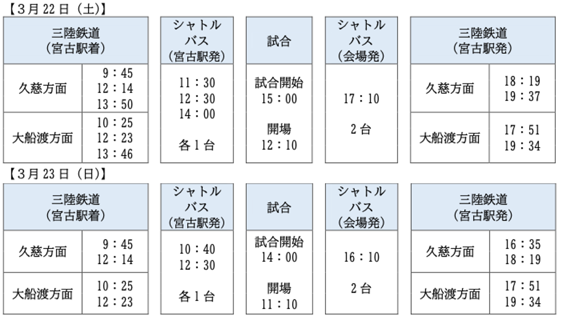 宮古駅から試合会場(宮古市⺠総合体育館)までのシャトルバスを運行いただきます。