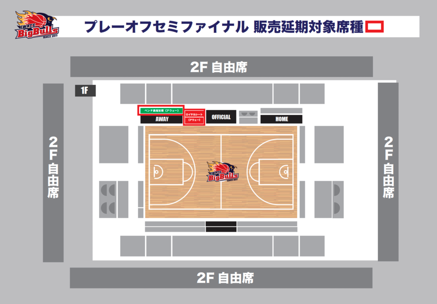 先行販売・一般販売までに対戦チームが決まらないことから、一部席種(アウェーベンチ付近)の販売開始日を延期させていただくことにいたしました。