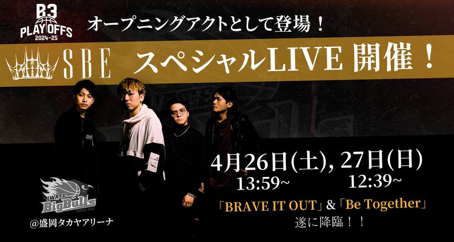 4/26(土)・27(日)盛岡タカヤアリーナで開催されるB3 PLAYOFFS QUARTERFINALS 2024-25で、遂にSBEの生LIVEが決定しました!