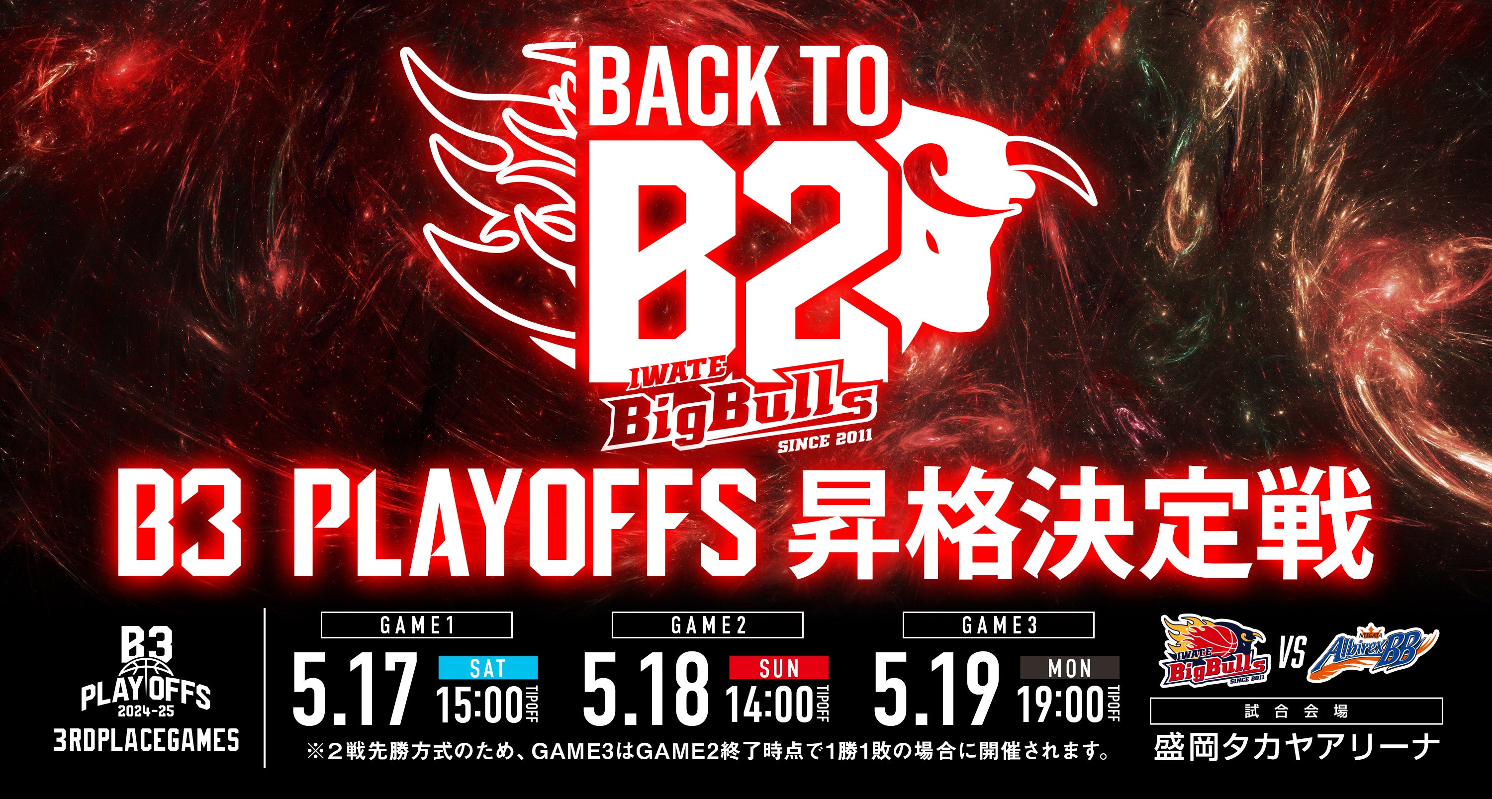 B3 PLAYOFFS SEMIFINALS 2024-25の試合結果に伴い、「B3 PLAYOFFS 3位決定戦(昇格決定戦) vs.新潟アルビレックスBB」が2025年5月17日(土),18日(日),19日(月)に盛岡タカヤアリーナで開催することが決定いたしました。