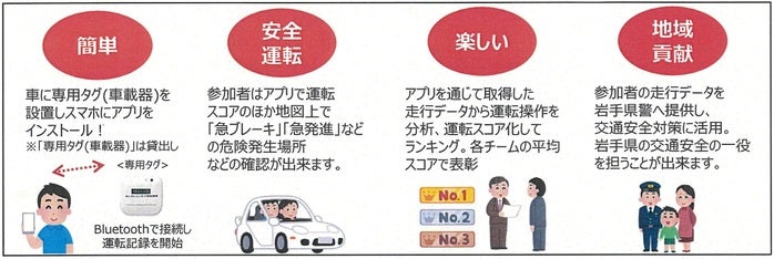 この度岩手ビッグブルズでは、あいおいニッセイ同和損害保険株式会社様、岩手トヨペット株式会社様、ネッツトヨタ岩手株式会社様、岩手トヨタ自動車株式会社様、トヨタレンタリース岩手株式会社様、日本生命保険相互会社盛岡支社様、岩手県様、岩手県警察様ご協力のもと、テレマティクス技術を活用した交通安全イベント「安全運転スコアチャレンジイベント」を実施いたします。