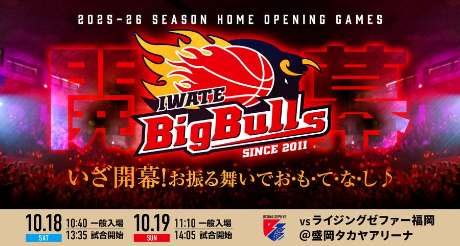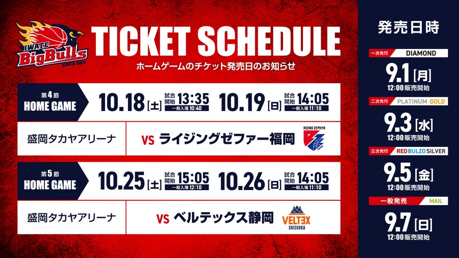 岩手ビッグブルズでは、2025年10月18日(土),19日(日) に盛岡タカヤアリーナで開催するライジングゼファー福岡とのホーム開幕戦および、10月開催ホームゲーム開催チケット販売スケジュールが決定いたしましたのでお知らせいたします。
