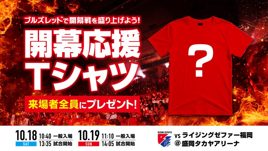 2025年10月18日(土)・19日(日)に盛岡タカヤアリーナで開催されるホーム開幕戦「2025-26SEASON B2リーグ戦 岩手ビッグブルズvs.ライジングゼファー福岡」にて来場者全員にTシャツをプレゼントいたします!