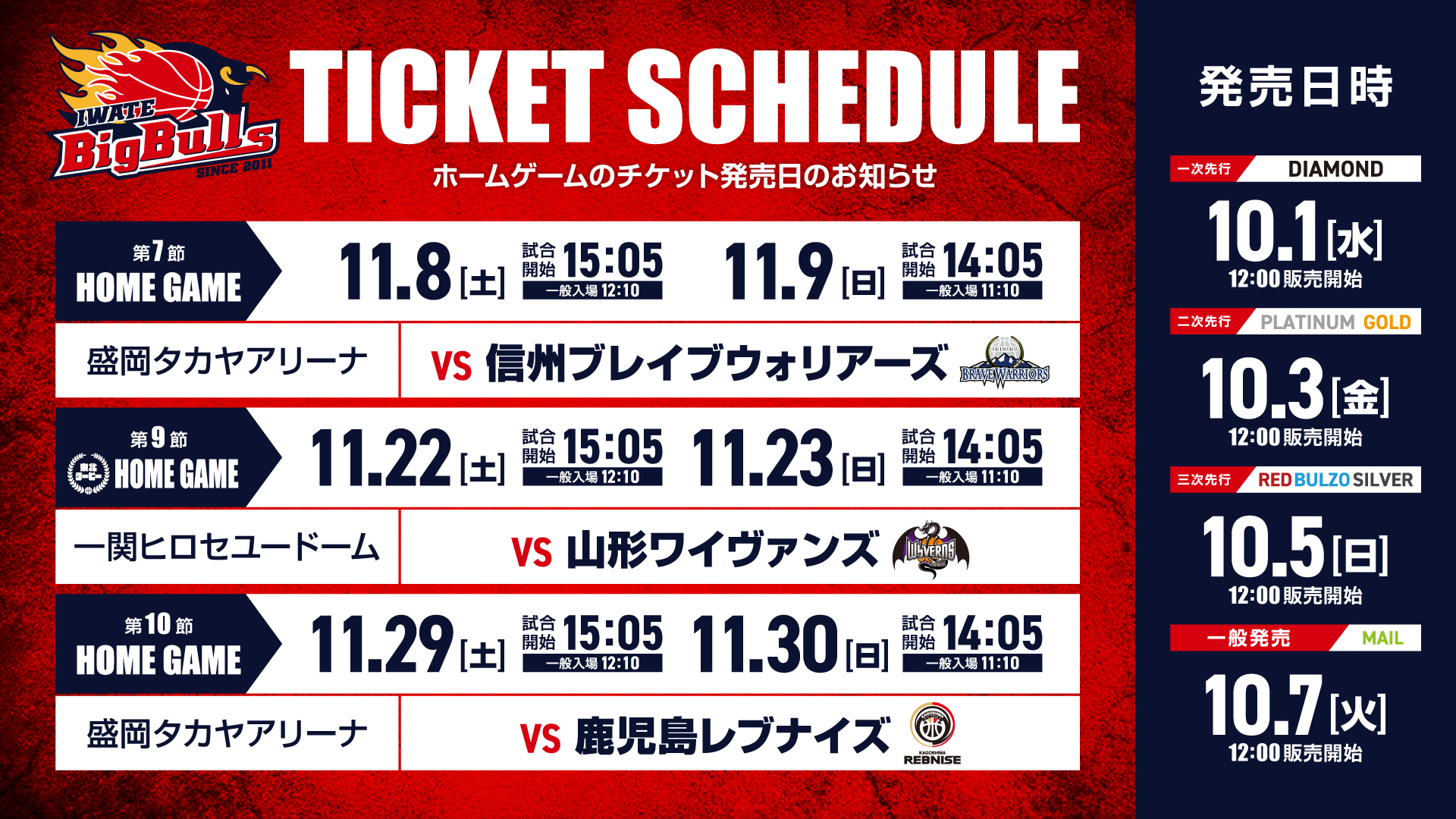10/7(火)12:00~岩手ビッグブルズ公式ファンクラブ「CLUB BIGBULLS」会員様は、一般販売に先駆けて、観戦チケットを先行でご購入いただくことができます!
