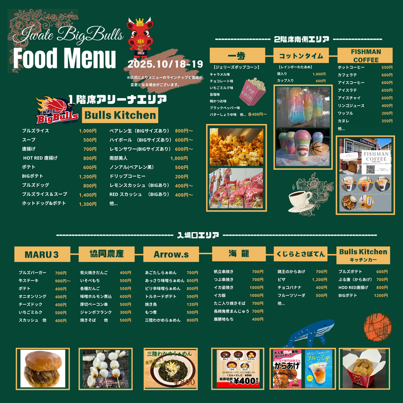2025年10月18日(土)・19日(日)に盛岡タカヤアリーナで開催する「B2.LEAGUE2025-26season 岩手県トラック協会/岩手日報社 Presents 岩手ビッグブルズvs.ライジングゼファー福岡」のアリーナグルメについてお知らせいたします。
