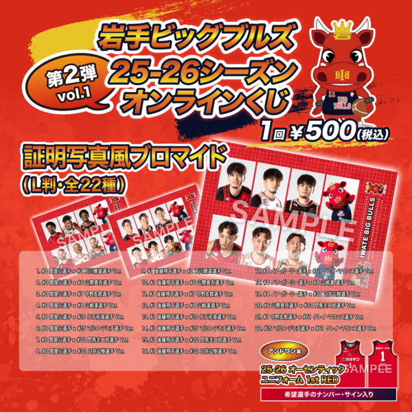 この度、25-26seasonホームゲーム開幕戦を記念して「岩手ビッグブルズ オンラインくじ 第2弾 Vol.1」の販売を開始いたしました。