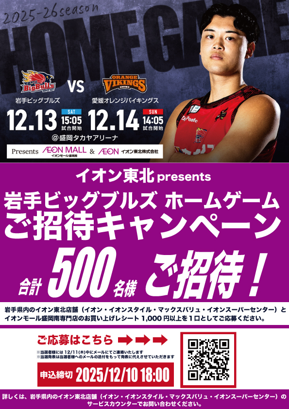 2025年12月13日(土),14日(日)に盛岡タカヤアリーナで開催する岩手ビッグブルズvs.愛媛オレンジバイキングスの試合で「イオン東北Presentsホームゲームご招待キャンペーン」を行います!