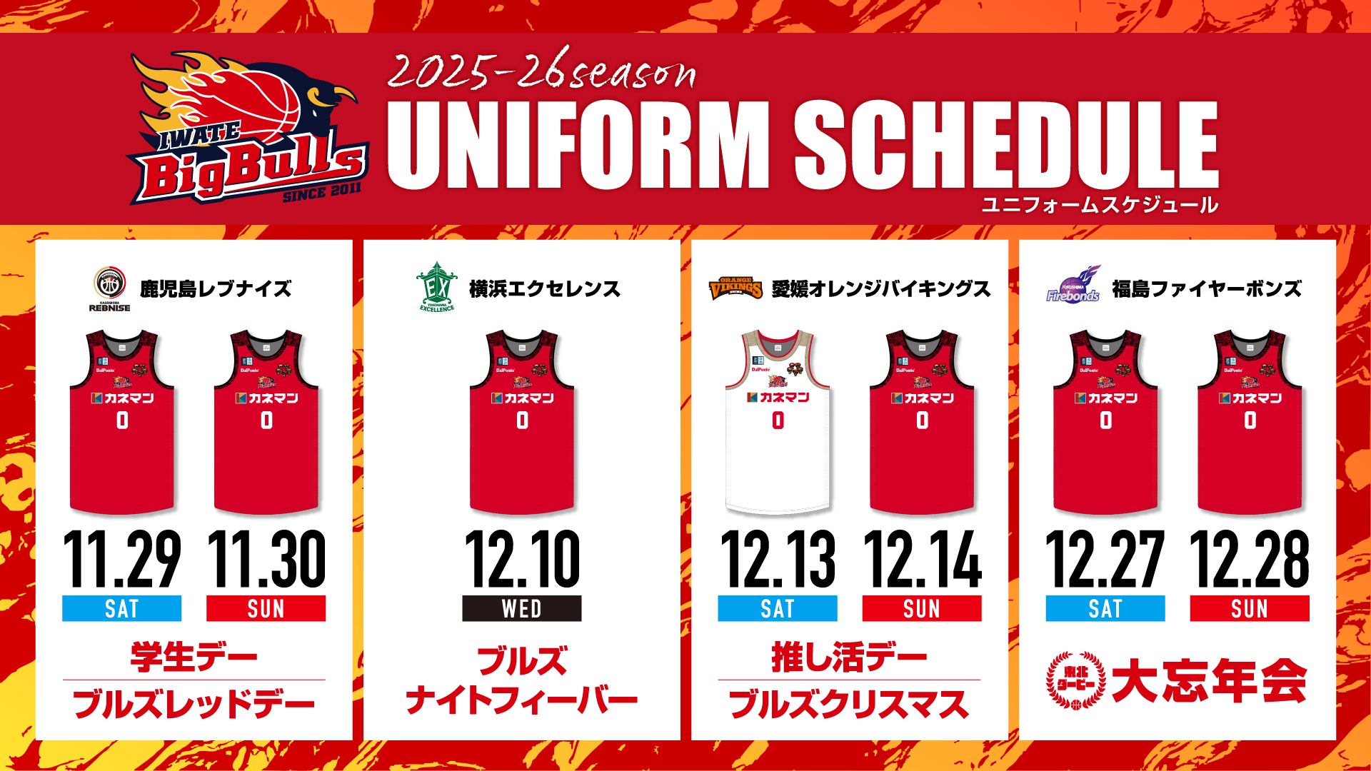このたび、選手が着用するユニフォームスケジュールに変更がございましたので、お知らせいたします。