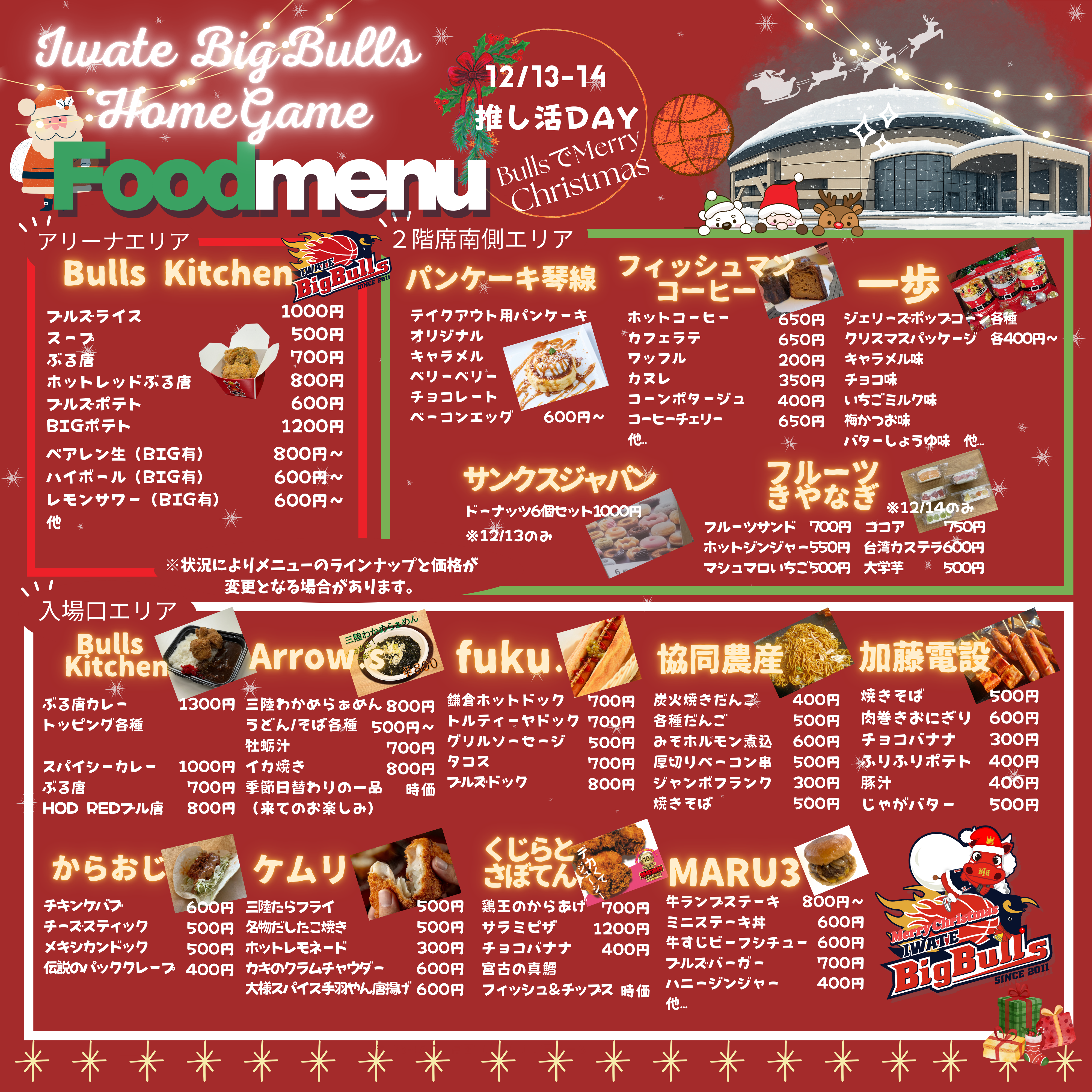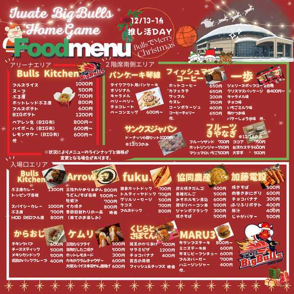 2025年12月13日(土),14(日)に盛岡タカヤアリーナで開催する「B2.LEAGUE2025-26season イオンモール盛岡南&イオン東北 Presents 岩手ビッグブルズvs.愛媛オレンジバイキングス」のアリーナグルメについてお知らせいたします。