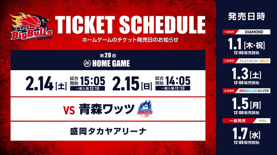 1/7(水)12:00~岩手ビッグブルズ公式ファンクラブ「CLUB BIGBULLS」会員様は、一般販売に先駆けて、観戦チケットを先行でご購入いただくことができます!