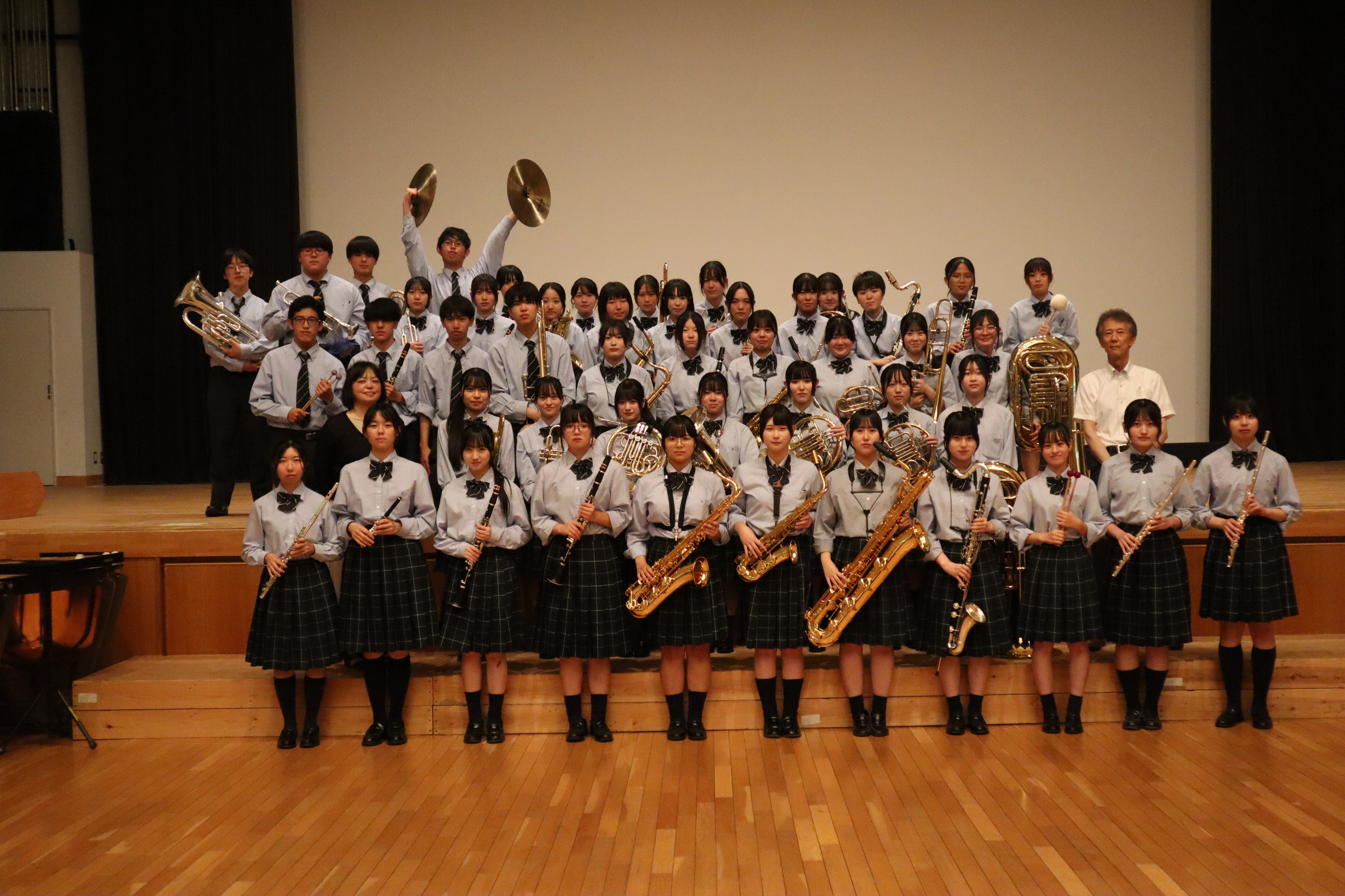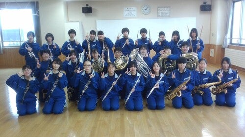 私たち厨川中学校吹奏楽部は、現在2年生16名、1年生13名の計29名で活動しています。部員一人ひとりが責任感をもって音楽に向き合い、日々の練習に全力で取り組んできました。そして本日、愛する地元・岩手ビッグブルズの試合に精一杯の演奏で花を添えさせていただくことを光栄に思います。感謝の気持ちを込めた、心を一つにした音で、会場の熱気を高めます!