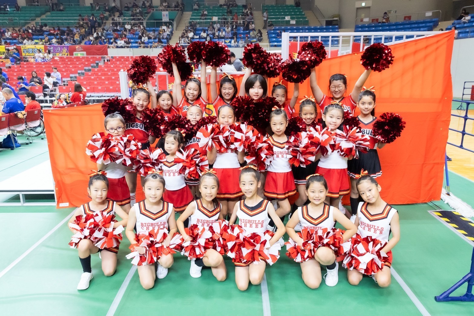にこっとハッピーでは、キッズだけではなく、ママやシニア、親子も活動しており、1歳から70代までの、幅広い年代の方がチアダンスを楽しんでいます。本日は、私たちのダンスでみなさんに【にこっとハッピー】になっていただけるよう、精一杯パワーをお届けしますので、お楽しみください♪ Let's Go!にこハピ‼ Go!Big!Bulls!!