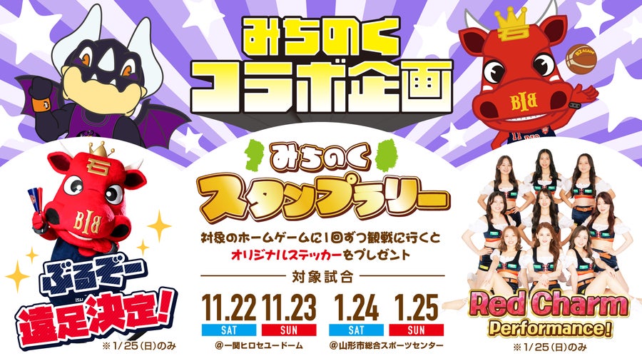1/25(日)はぶるぞー&Red Charmが山形市総合スポーツセンターを訪れ、様々な場面で一緒に会場を盛り上げさせていただきます!